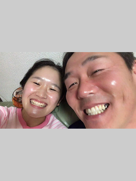友達から貰ったお試し1回分の美容液を顔に塗ったところ、余ってしまいました。そこで、お父さんの顔にも塗ったら2人してテカテカになって笑っている写真です!