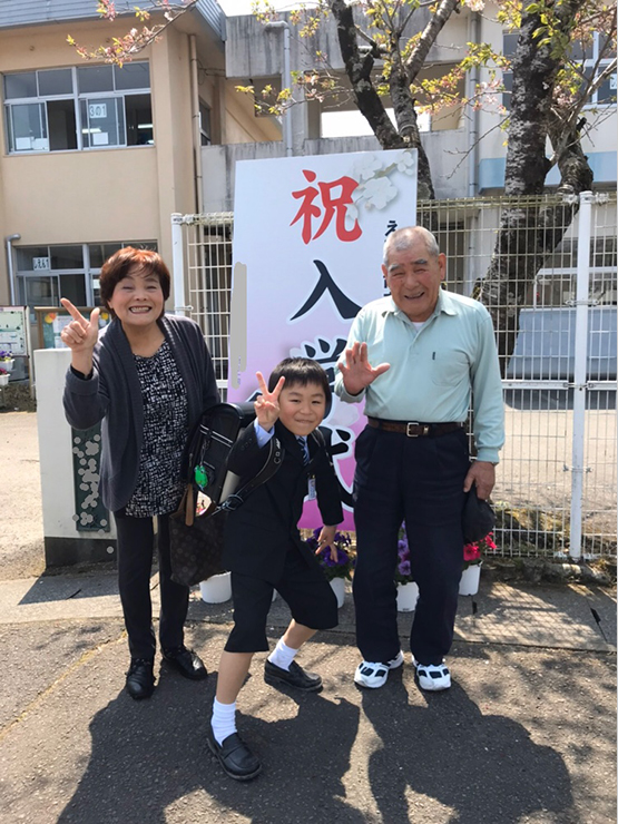 長年、この日の参観を楽しみにしていた祖父母。制限なある中、幸い式典を行なってもらえました。終了に合わせて、せめて写真だけでも~、と駆けつけてくれました。喜んでもらえて良かった!おかげさまで元気に育ちました。