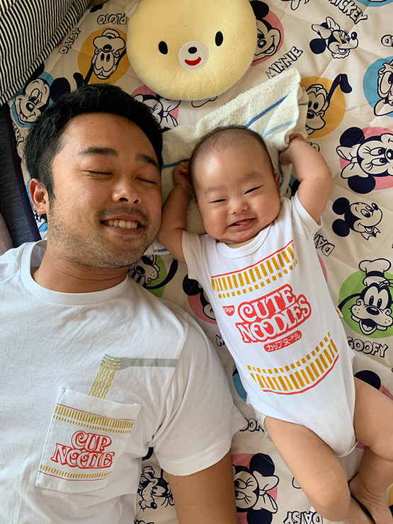 夫が息子とお揃いの服を着て写真を撮りたいと言いとった写真です。お互い大好きな人の横で満面の笑みです。何回見返してもみてもこちらも笑顔になれる写真です。