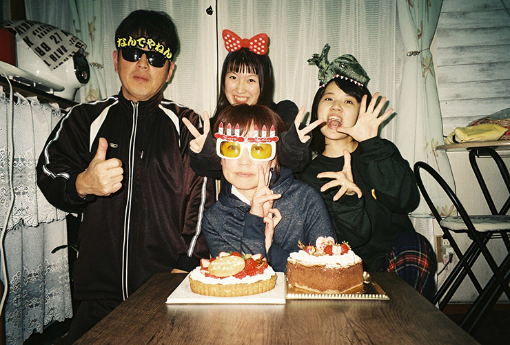 母親の誕生日にみんなでサングラスなど付けて記念写真を撮りました