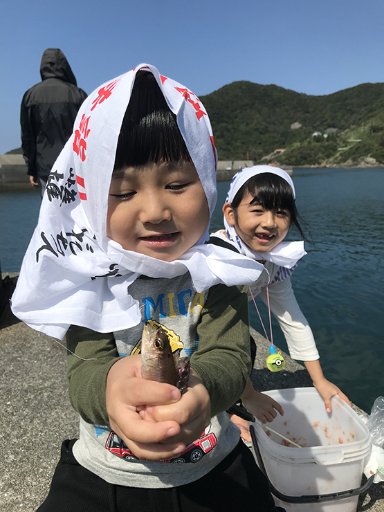 なかなかコロナで帰省できませんでしたが、久しぶりに連休がとれたので、パパの実家に帰省。近くの海で魚釣りをしました。帽子がなかったので、急遽手拭いを日よけにして。