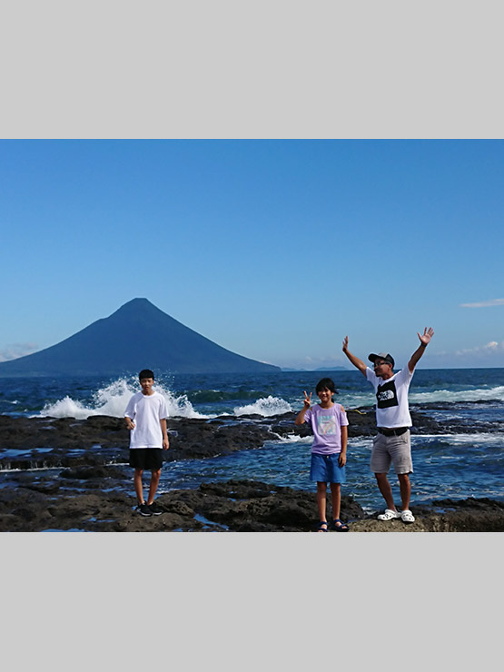 高千穂峰を前に右手をかざし、家族の絆が続くことを約束しました。