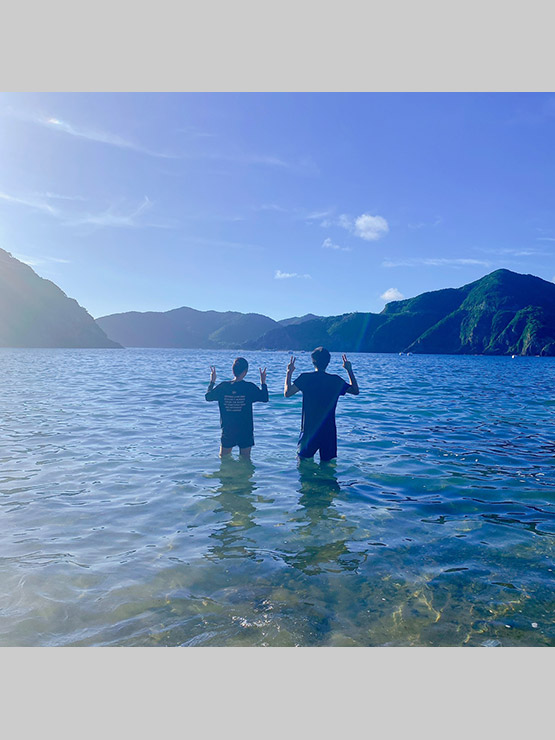 東シナ海と開聞岳をバックに撮りました。快晴で海風がとても気持ち良かったです!解放感に駆られたのか無邪気に主人のみバンザイしていた所を撮りました。