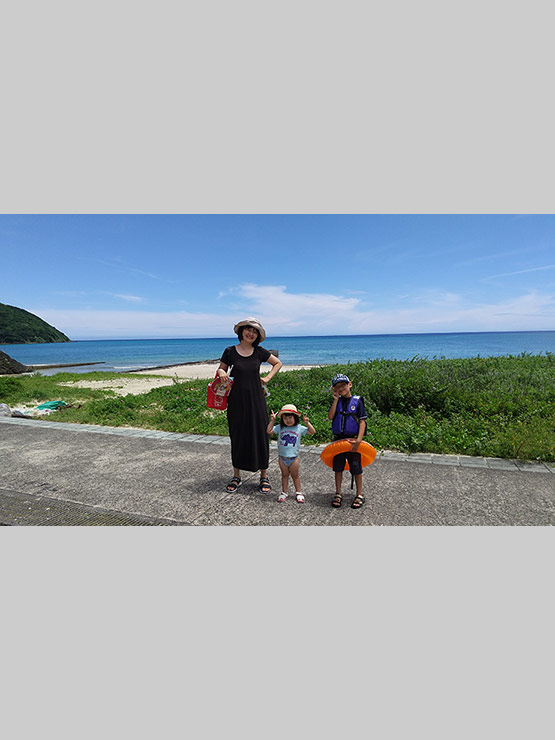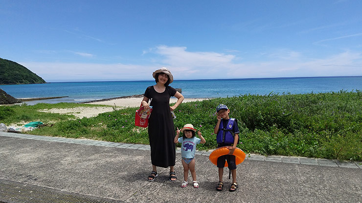 奄美の海。晴れていてキレイな景色と泳ぐ前に一枚。子供達は泳ぎたくてウズウズしてます。