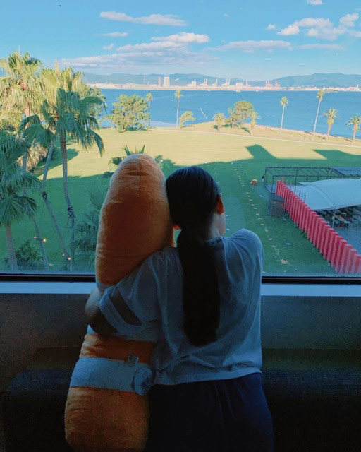 そのぬいぐるみと海を眺めているひとコマです。