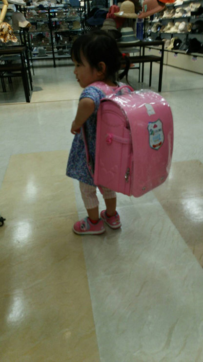 お姉ちゃんのランドセルを買いに行ったとき、誰よりも真剣にランドセルを選んでいました。お気に入りが見つかったようです。