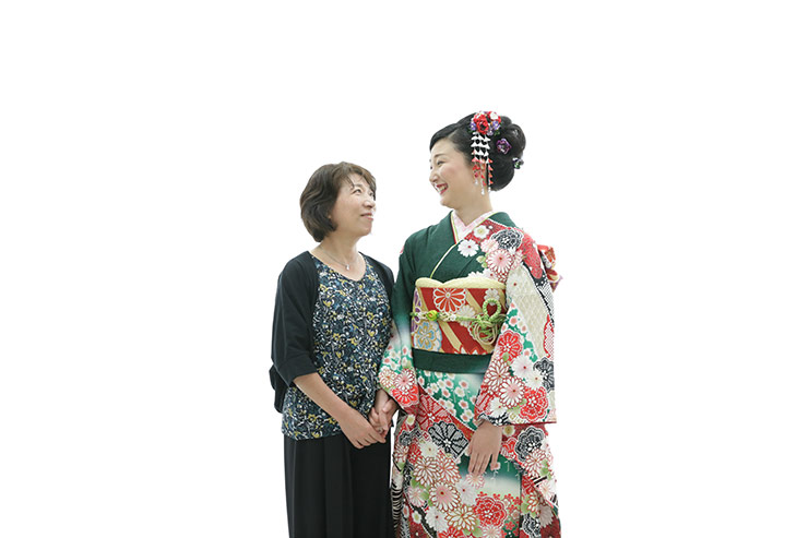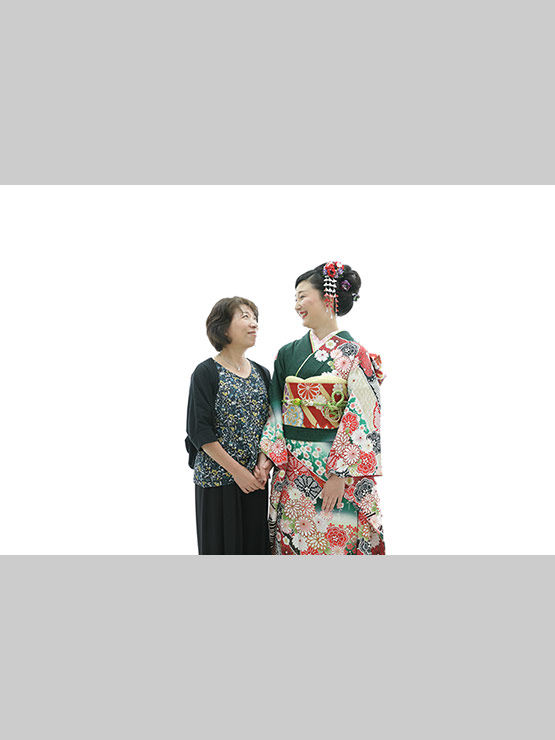 成人式の前撮りで撮られている私を見ながら涙ぐんでいる母。最後は母を呼んで一緒に撮っていただきました。ここまで育ててくれた感謝の気持ちを忘れない思い出の1枚となりました。