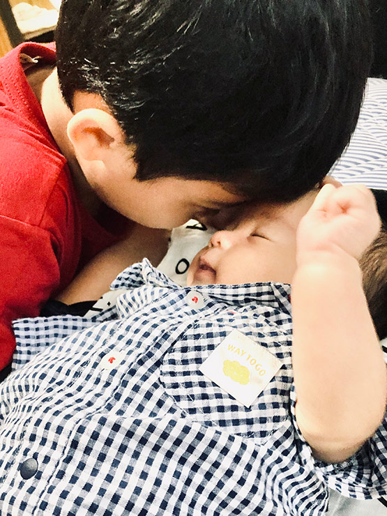 いつも相思相愛の兄弟で、お兄ちゃんが笑うと弟もケラケラ声を出して笑います!この写真は、そんな仲のいい兄弟の日常の写真です!お兄ちゃんの弟への愛が伝わる優しい顔の写真なので、今の世の中の生きづらさから私の心が解放される、何度見ても心がほっこりするような大好きな写真です!