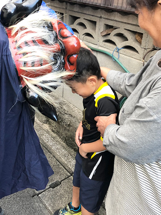 地元のお祭りの写真です!獅子舞に頭を噛んでもらえると長生きする?健康になる?みたいで、ばぁばに押されて嫌々頭を噛まれてます!今年はお祭りなくなったので、すごく残念です。来年はお祭りができるといいなと思います!