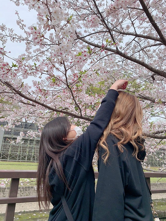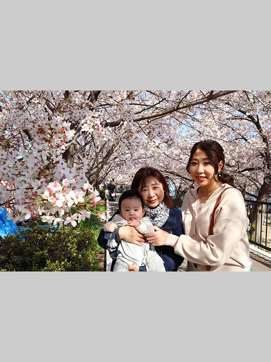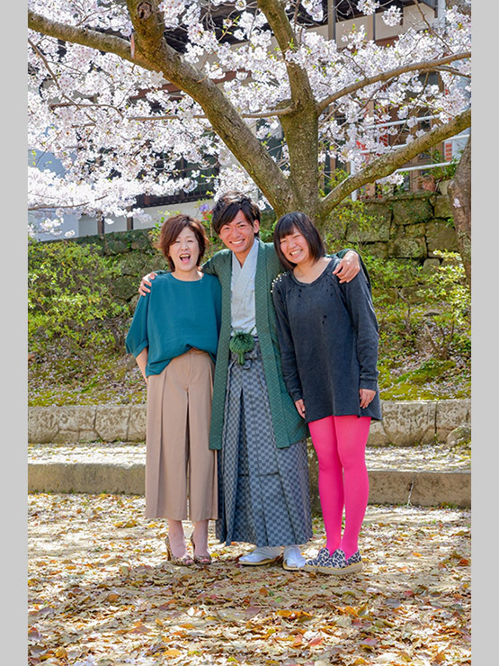 成人式の前撮りの付き添いで行ってた時、急遽記念にと撮った家族写真。桜満開だったので、笑顔満開で撮りました。