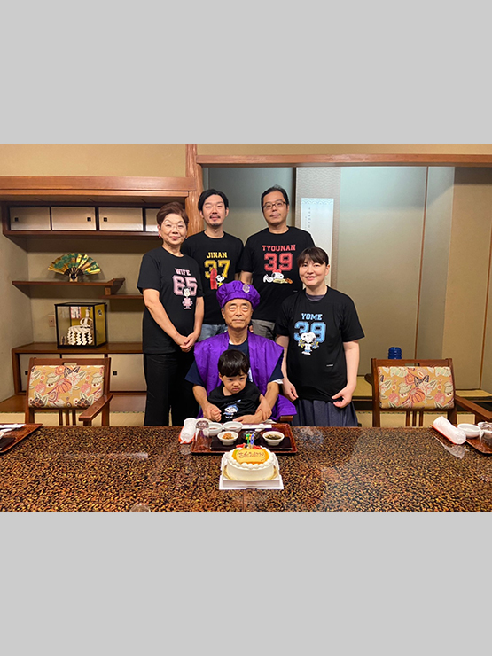 じいじの古希のお祝いを家族お揃いのTシャツを作りました!名前でなく、妻、嫁、長男、次男、孫と年齢をいれてユニークなTシャツで撮りました!