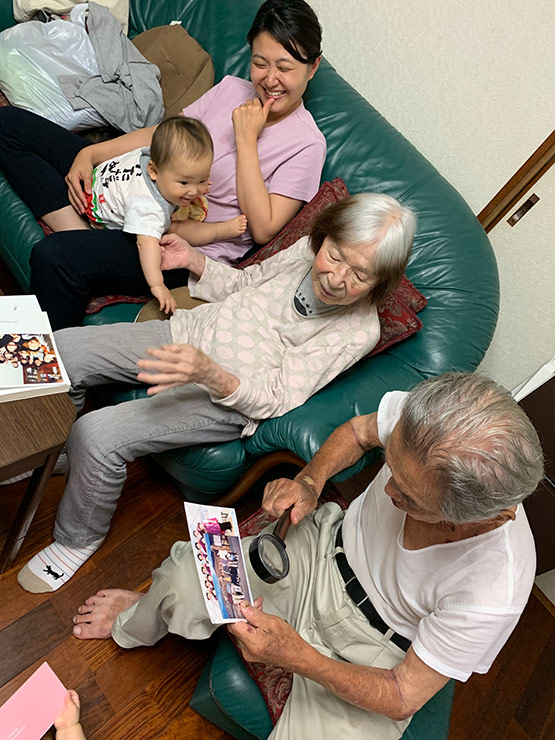 写真をみるときに虫メガネを使うおじいちゃん。真剣に見ているひいおじいちゃんをひ孫が「ひいおじいちゃん、何してるのー?」と言っているように見える1枚です。