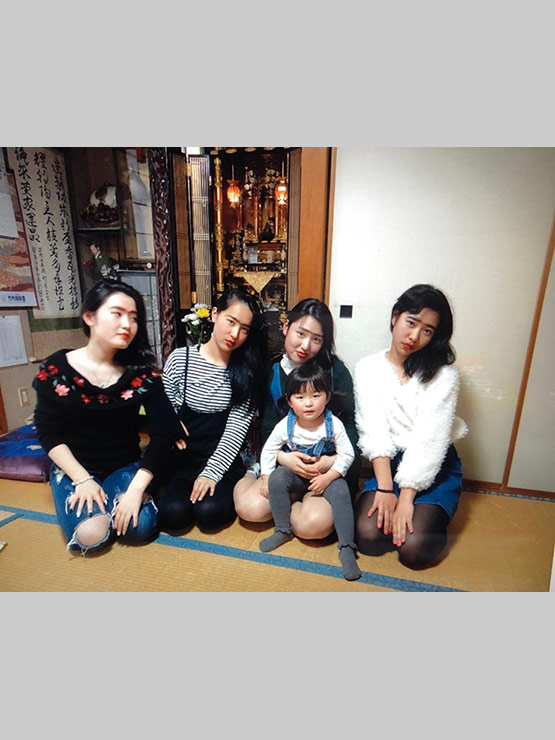 の声で二家族の女の子が集まり背の順に並んでる写真です。