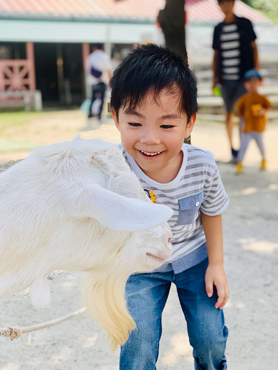 初めはヤギを怖がって全然近づかなかった息子ですがエサをあげて徐々に距離を詰めていきこんなに近くでヤギを触ることができて、とっても嬉しそうな息子の笑顔が可愛かったので、この写真を選びました!