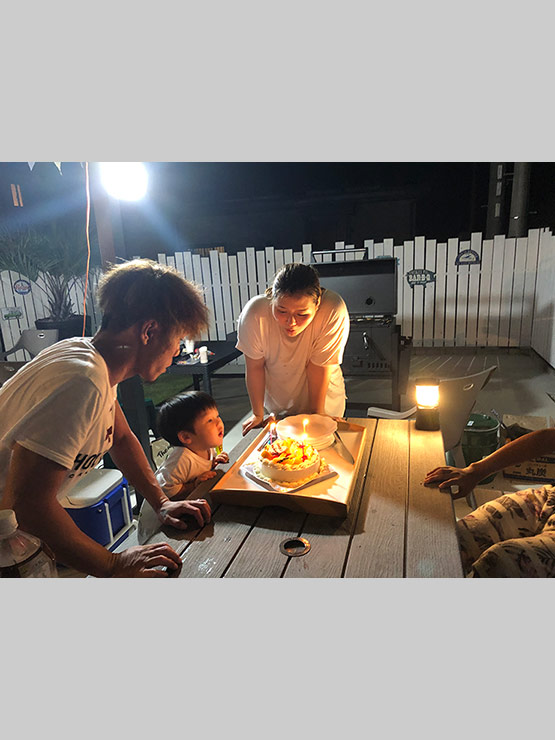 親族10人が集まって、バーベキューの後、ケーキのロウソクを吹き消しました。