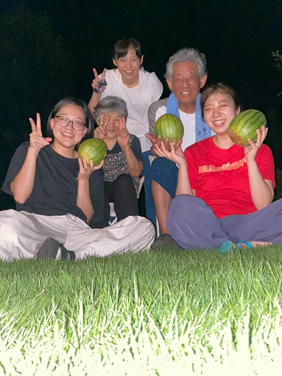 孫が大好きスイカ🍉を一生懸命作ったおじいちゃんと孫の笑顔。コロナに負けない夏の仲良し家族写真