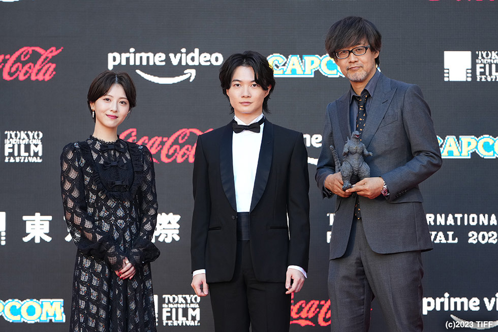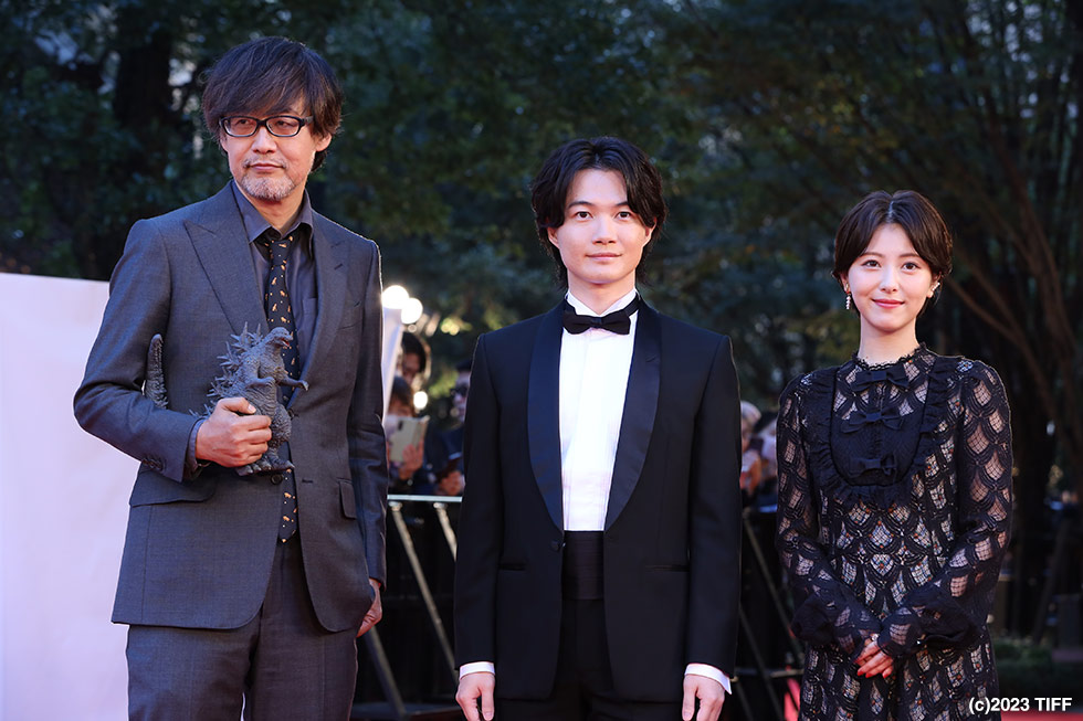 東京ミッドタウン日比谷ステップ広場に設けられたレッドカーペットでは、トップバッターに、クロージング作品の『ゴジラ-1.0』から神木隆之介、浜辺美波、山崎貴監督が登場。